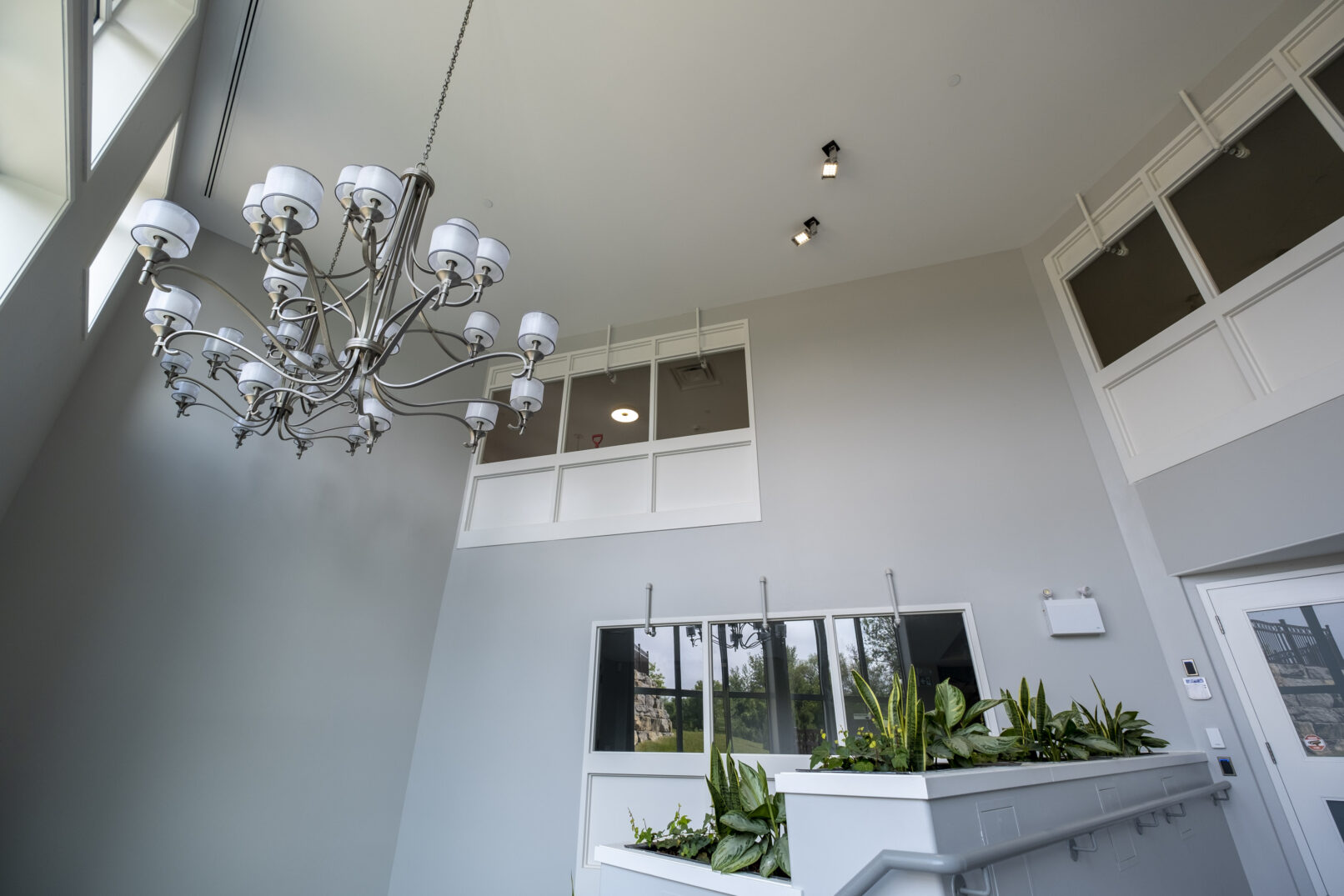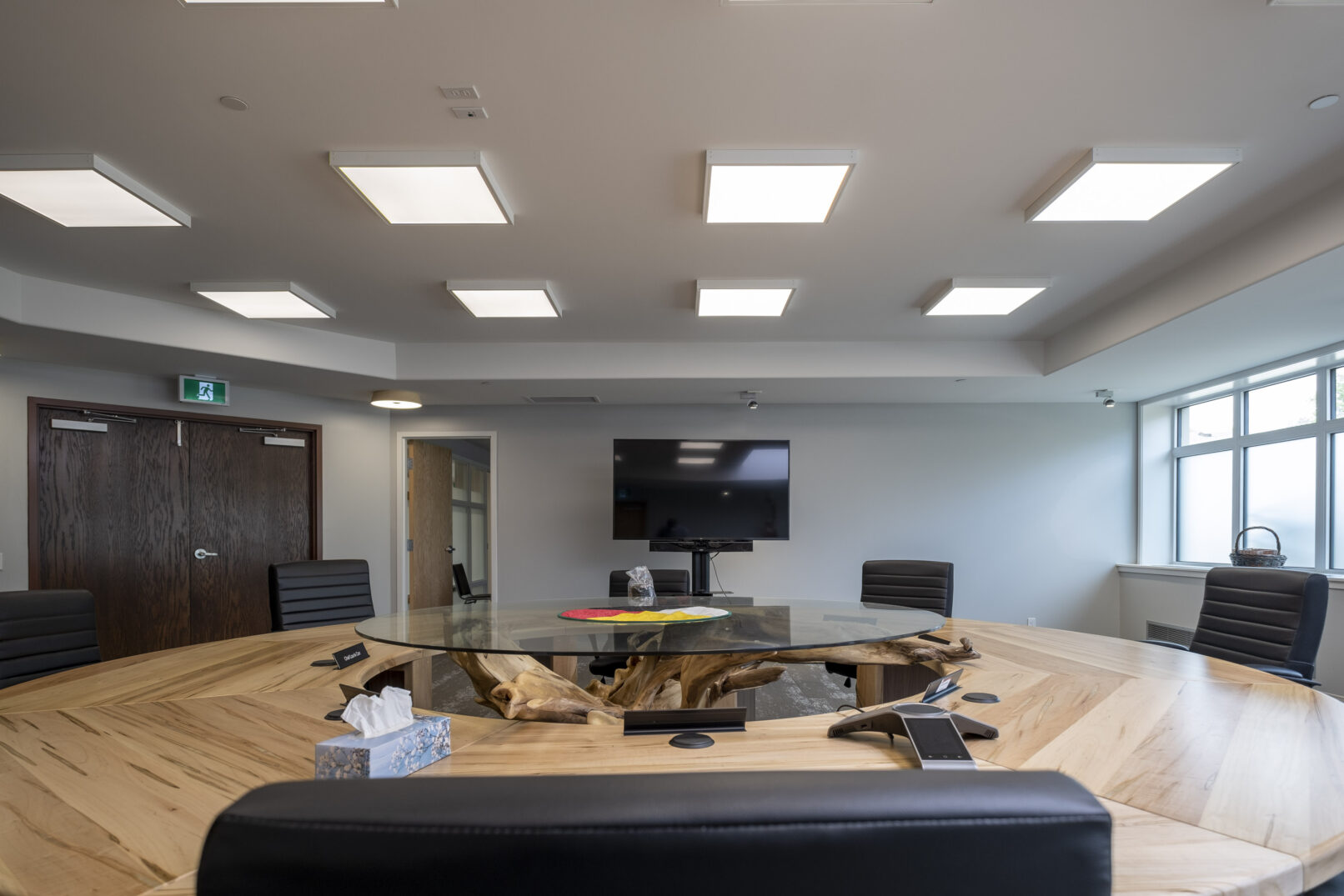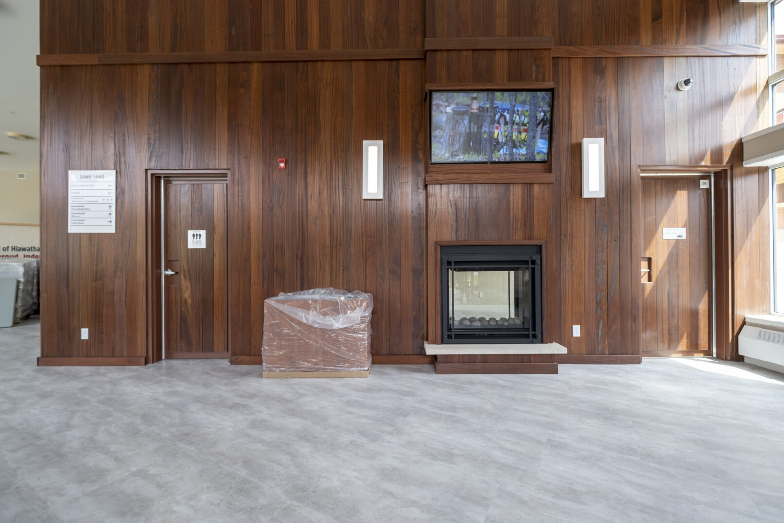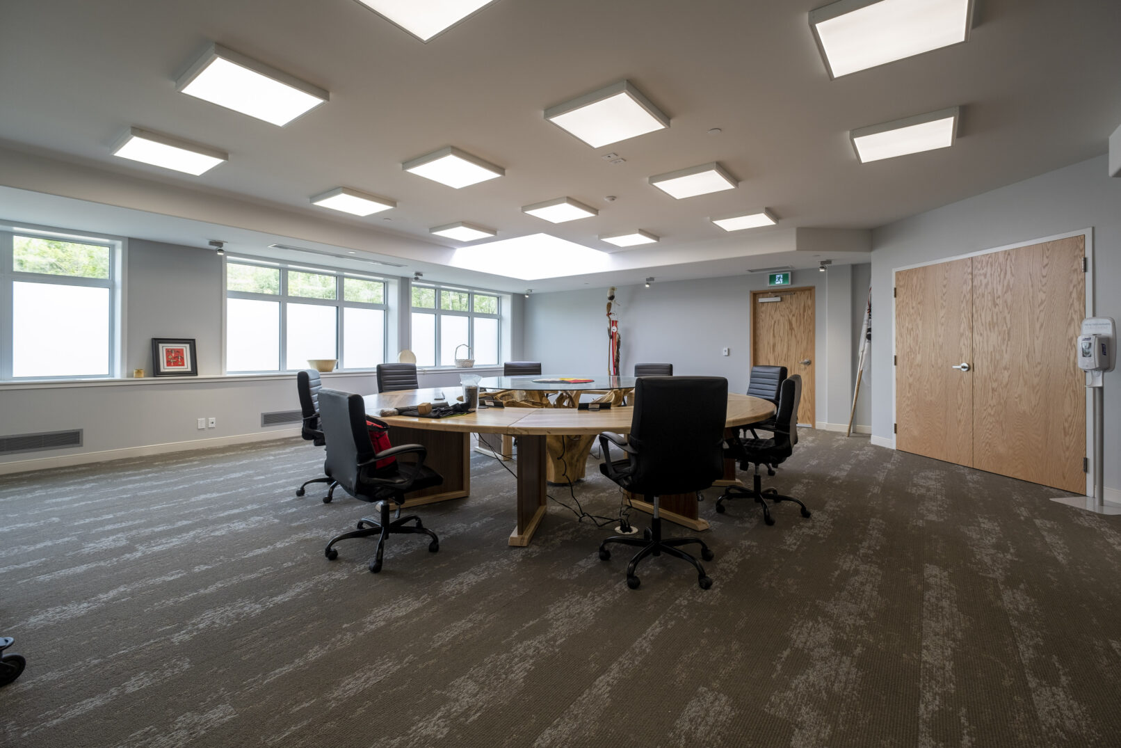 The site is beautifully characterized by the walkout basement, inclusive of naturalized landscaping with limestone boulder retaining walls, fire pit with coloured and exposed aggregate concrete plaza deck for ceremonial events, outdoor stage area, outdoor basketball court, and an asphalt paving walking path that overlooks the ravine lot backing towards Rice Lake. This energy efficient building included a building envelope with fiberglass windows, aluminum siding reciprocating a wood plank charm, and EIFS which was detailed to replicate the existing masonry veneer on existing building. On the interior of the building the millwork, floor and wall finishes were completed with naturalized earth tone colours and textures, to bring the feel of the outdoors into the building spaces. In the event of a power failure, the site is backed up with propane fueled emergency generators that allow the operation of the mechanical systems, elevator, emergency lighting, sprinkler, and fire alarm systems. As the project included a large Cash Allowance of $1.23-million, JR Certus was successful in working together with Hiawatha First Nation and the Team of Consultants to ensure design development for key items were completed, coordinated, and scheduled to minimize impact on the progression of the project and overall schedule. The Cash Allowance included key elements of the project such as the planter boxes at the grand stair, landscaping and retaining walls, youth centre building and site upgrades, water features.