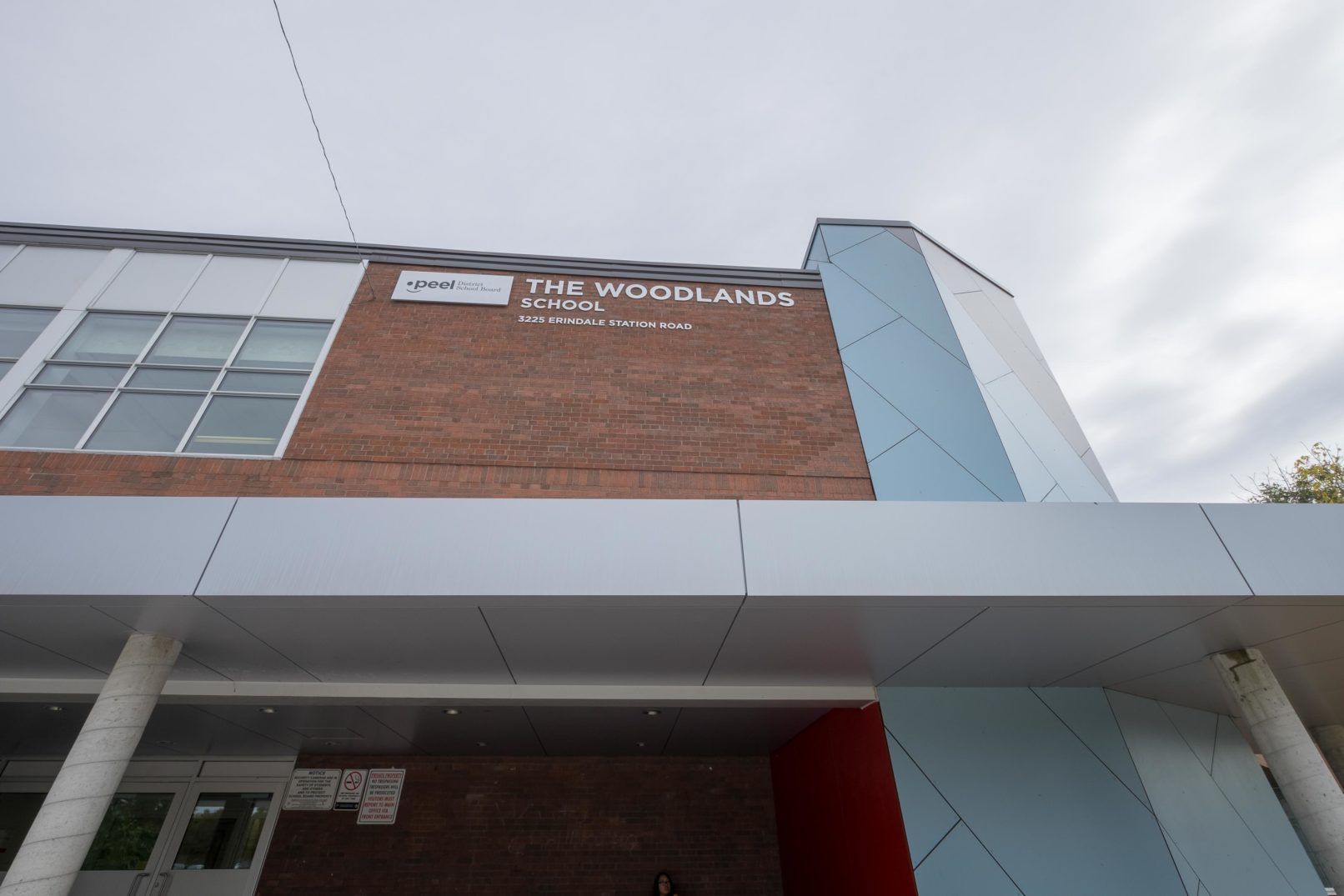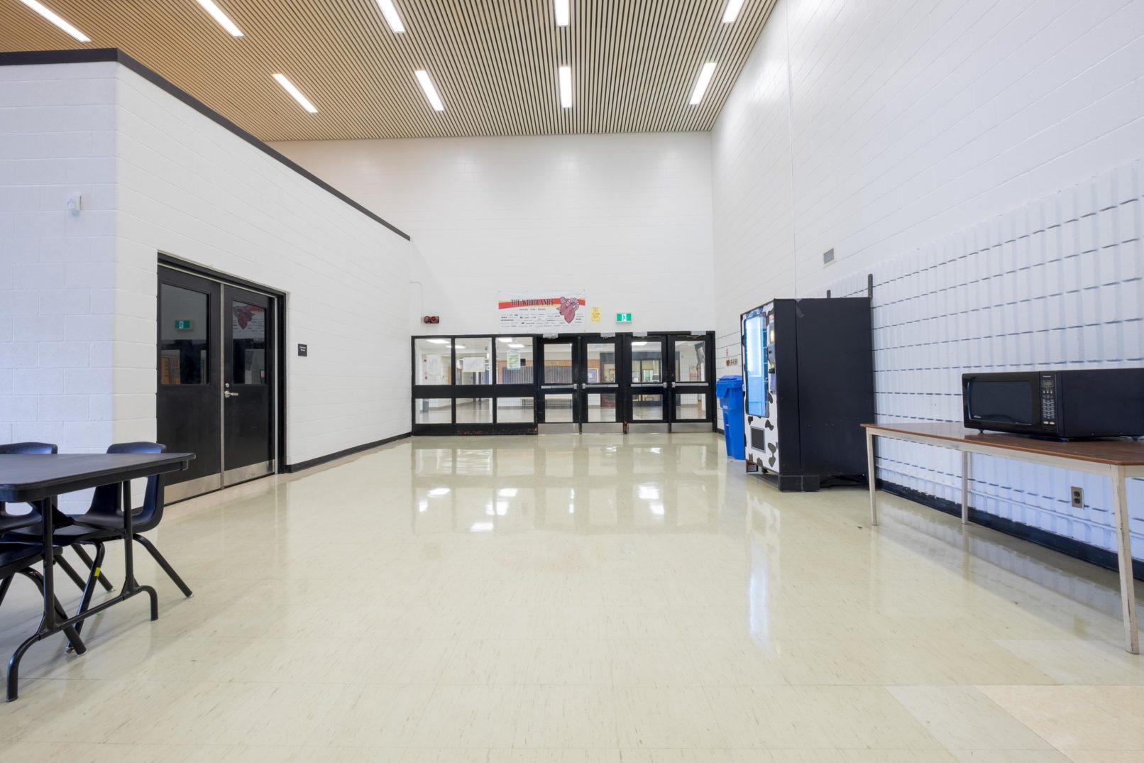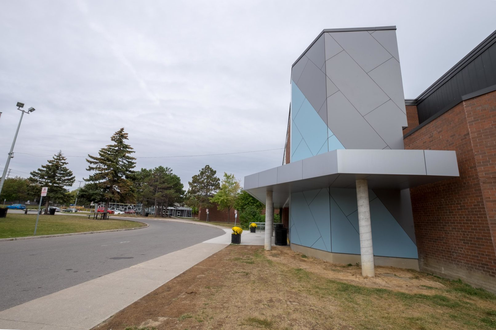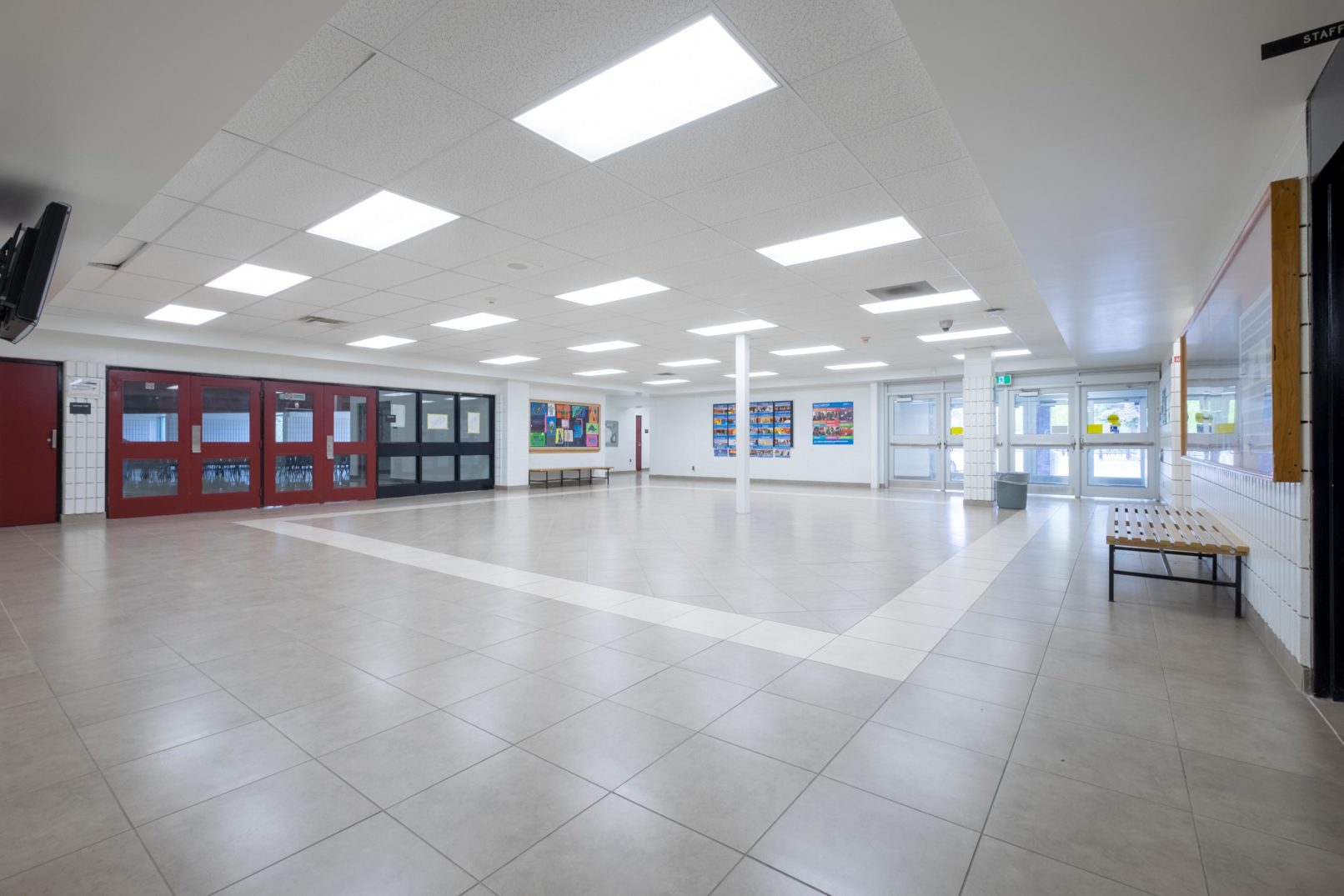 Project comprised alteration and renovations to an existing secondary school building. The alterations included the conversion of the abandoned library to a new elementary wing consisting of five new classrooms, seminar room, storage room, three washrooms and mechanical upgrades (VRF system). Exterior and interior renovations at the front entrance were performed which included a canopy with aluminum cladding and an elevator addition with exterior high-density laminate panels.